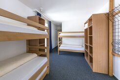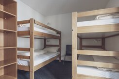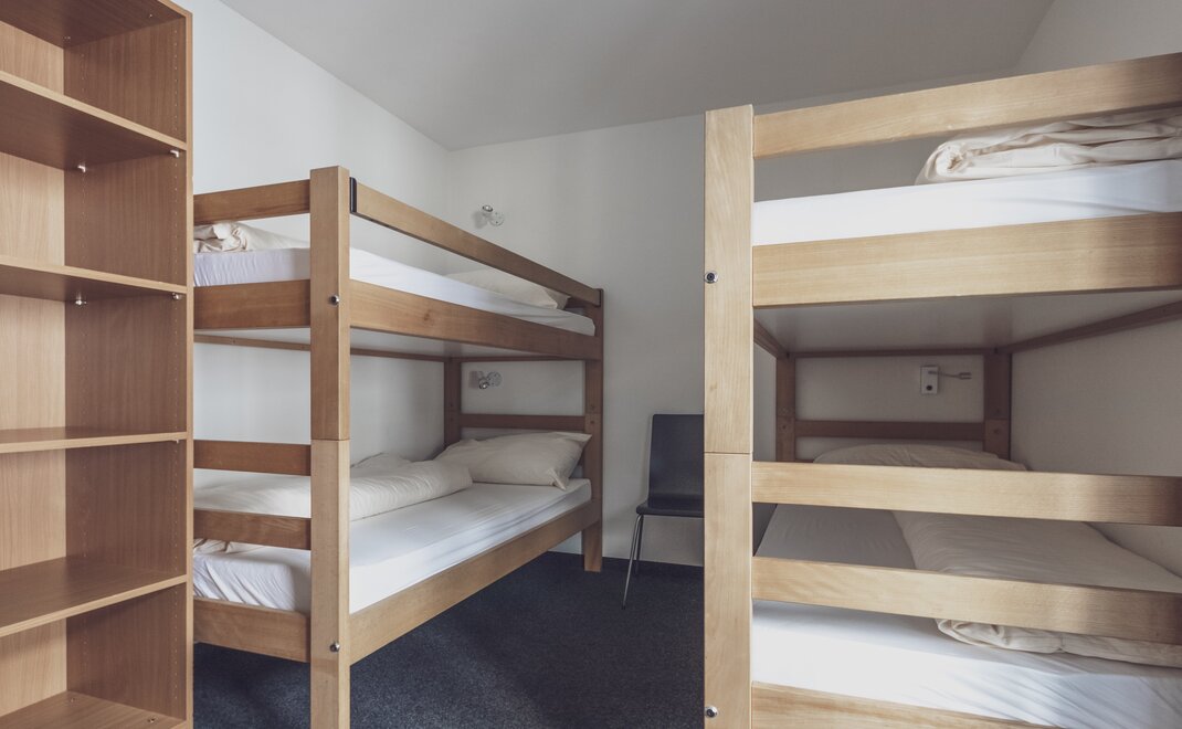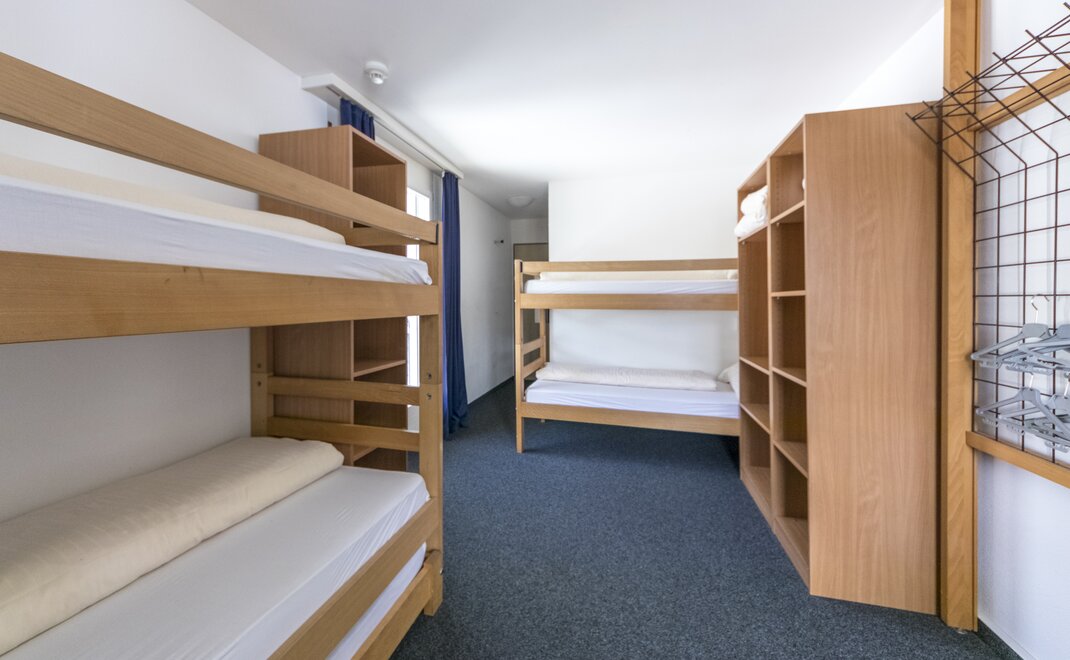 Die Vier- und Fünfbettzimmer verfügen über Hochbetten und Ablageflächen. Für genügend Tageslicht sorgen die bodentiefen Fenster und bei einigen Zimmern ein sonniger Balkon. Für den Aufenthalt wird Bettwäsche zur Verfügung gestellt. Frottierwäsche wird von den Gästen selbst mitgebracht.