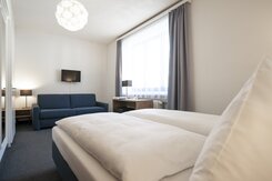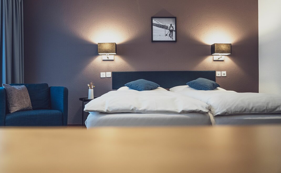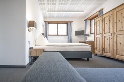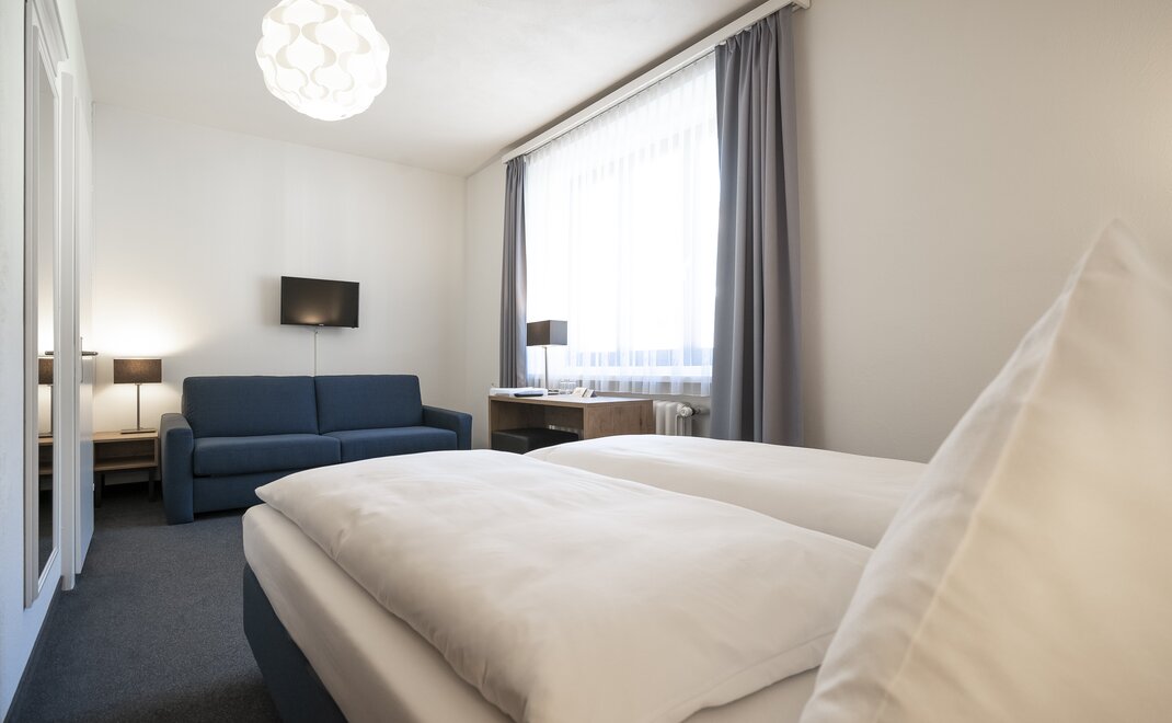 Doppelzimmer mit Bettsofa und Badezimmer. Ideal für Familien. Die Bettengrösse beträgt zwei Betten mit den Massen 90x200cm.