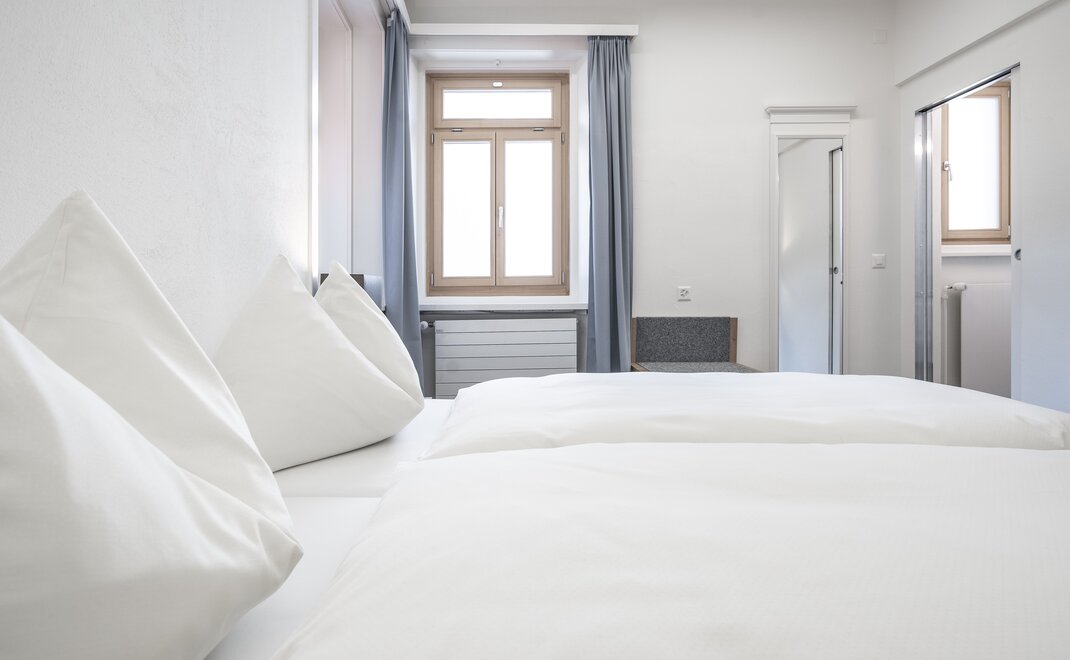 Doppelzimmer Deluxe mit Badezimmer. Die Bettengrösse beträgt zwei Betten mit den Massen 90x200cm.