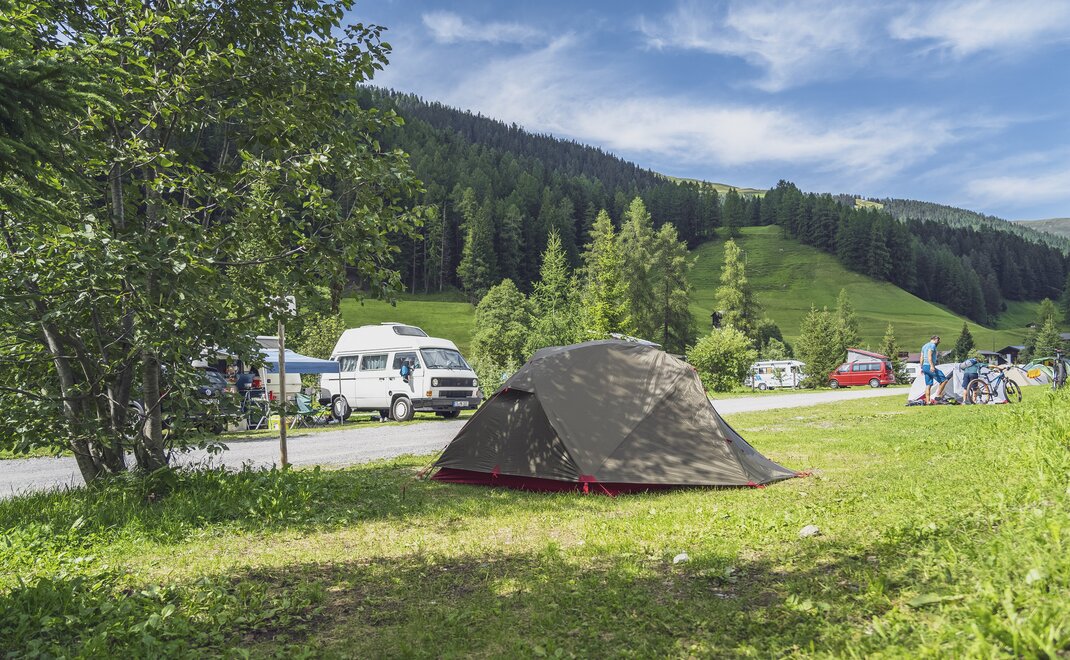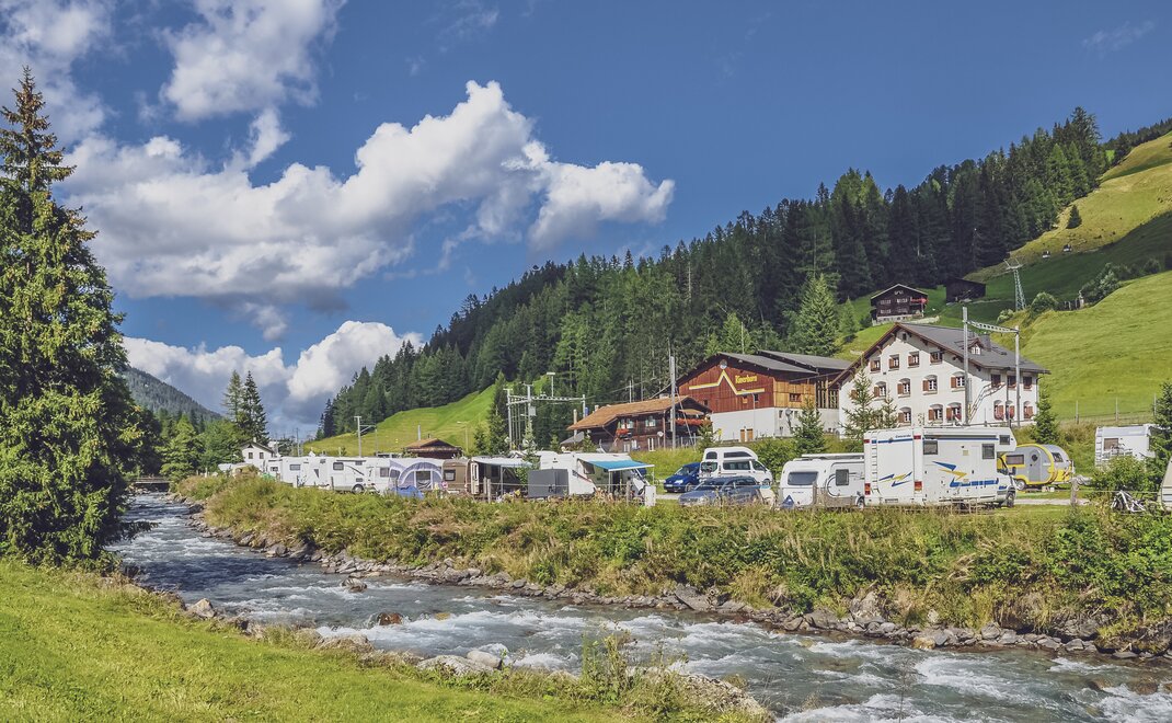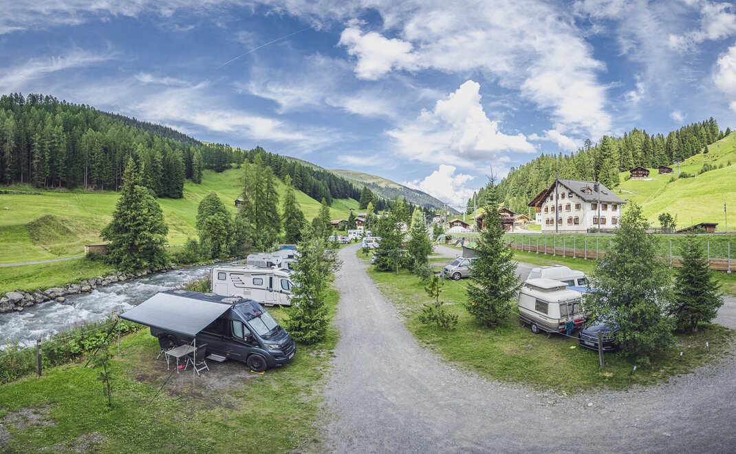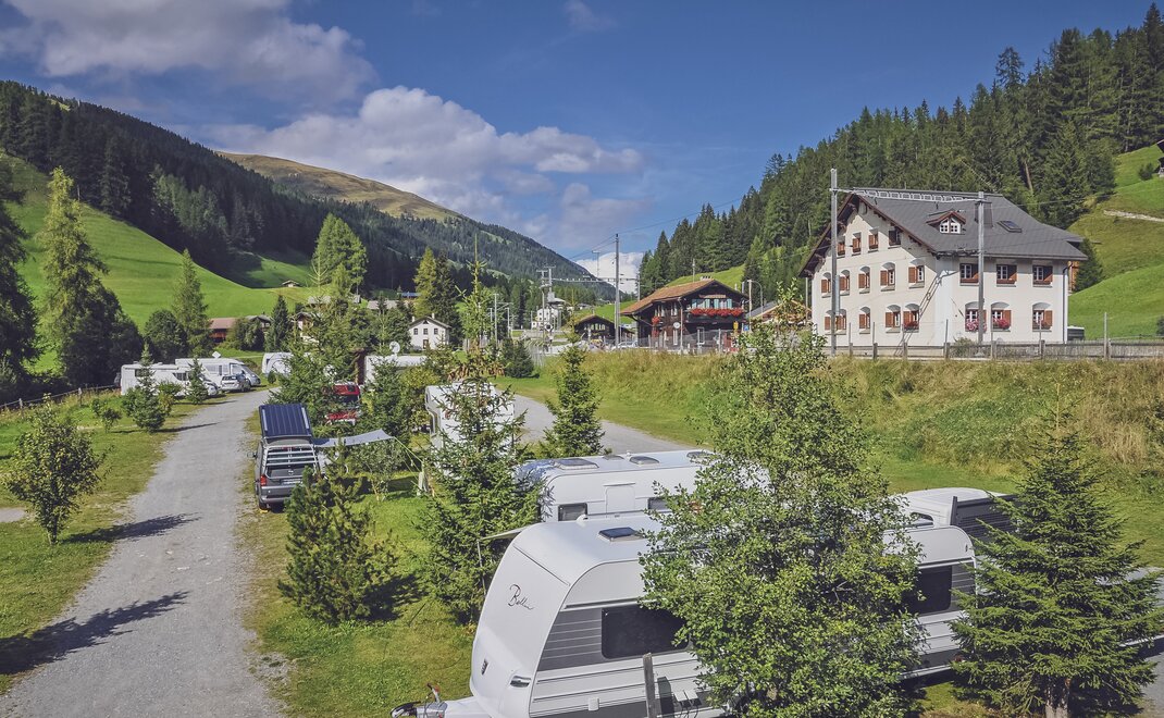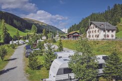 Neben der Gruppenunterkunft befindet sich auf der Anlage auch ein Campingplatz. Die Stellplätze liegen direkt am Fluss Landwasser inmitten der Bündner Bergwelt und ist sowohl im Sommer als auch im Winter bei aktiven Gästen beliebt. Naturliebhaber können sich auf einen Urlaub mit viel Flexibilität freuen, entweder im Zelt oder im eigenen Wohnwagen.