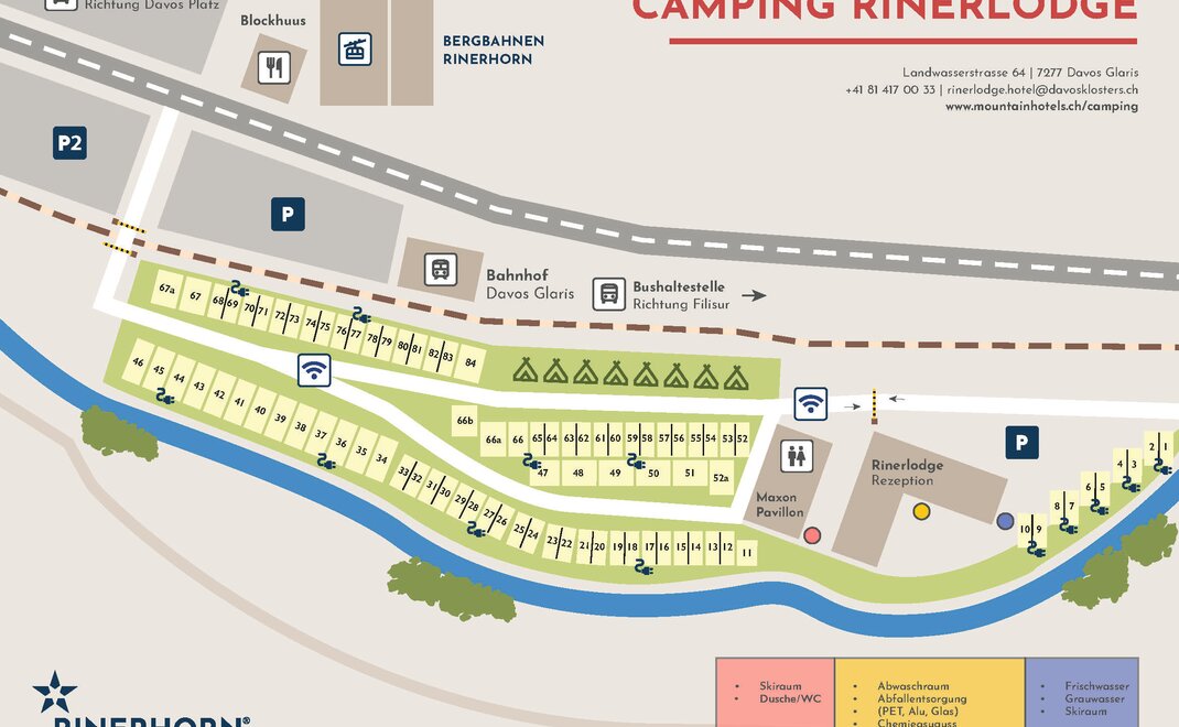 Der Campingplatz verfügt über 84 Stellplätze mit Stromanschluss. Die markierten Flächen für das Zelt oder den Camper messen 4.5 x 9m. Sanitäre Anlagen, Abfallentsorgung, Frischwasserversorgung und ein Geschirrwaschraum sind vorhanden. Gegen eine kleine Gebühr können Waschmaschinen und Trockner benutzt werden. Auch das Entleeren des Abwassertanks und der chemischen Toiletten ist möglich. Für die Unterhaltung bei schlechtem Wetter können die Aufenthaltsräume in der RinerLodge, mit Internetanschluss und Fernseher, genutzt werden.
