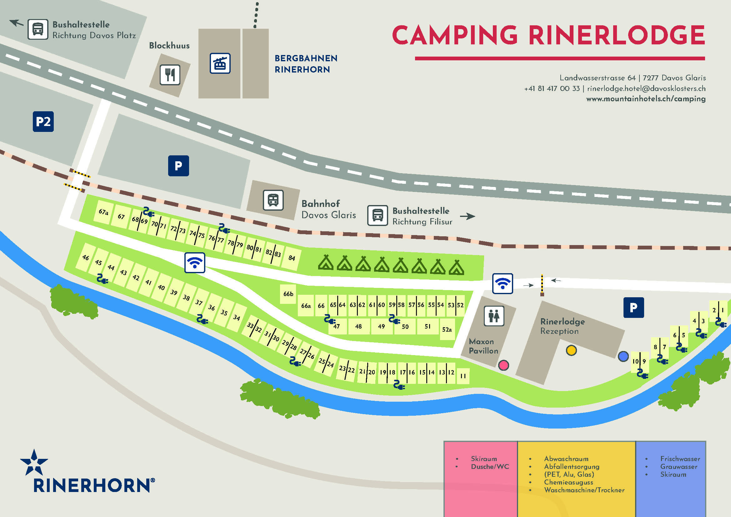 Das Leben im Zelt ist nicht nur für Familien ein Erlebnis. Das Erlebnis Campingurlaub beginnt, sobald die Zeltheringe im Boden stecken oder der Wohnwagen auf dem Platz aufgestellt ist! Es gibt alles, was man braucht, wie Wasser, Strom und einen Waschplatz. Duschen und Toiletten befinden sich auf dem Campingplatz, und es gibt auch eine Waschmaschine und einen Wäschetrockner. Ausserdem gibt es in den Gemeinschaftsräumen der Rinerlodge WLAN für die Gäste.