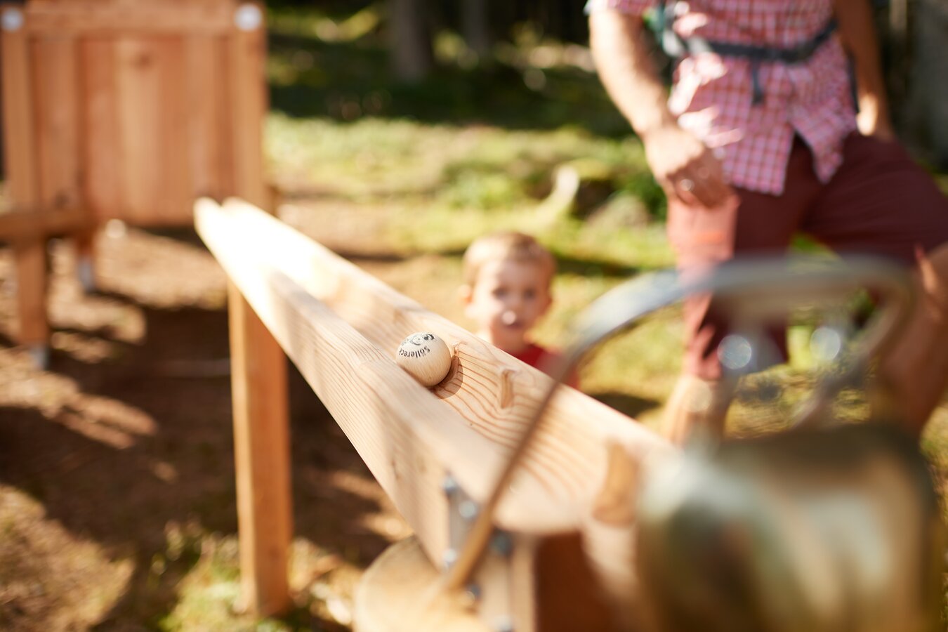 In der hölzernen Kugelbahn wird die Geschichte der Madrisa-Bande weitererzählt. Huhn Hanna soll durch die Bahn wieder Freude am Eierlegen finden – doch ihr Ei erlebt eine abenteuerliche Reise bis ins Nest. Wer Hanna helfen will, ihre Eier sicher ans Ziel zu bringen, ist im Madrisa-Land genau richtig.