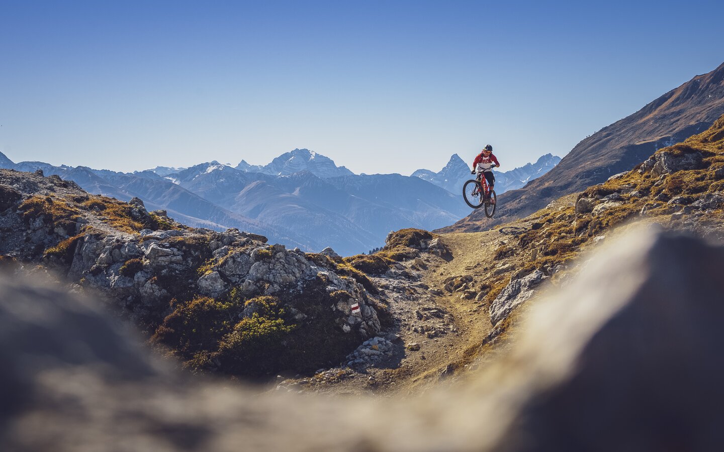 Den längsten Singletrail der Alpen solltet Ihr nicht verpassen. Auf dem legendären Alps Epic Trail warten flowige Abfahrten und wunderschöne Strecken zum Pedalieren. Ausserdem ist die gesamte Strecke von einer traumhaften Berglandschaft umrundet.