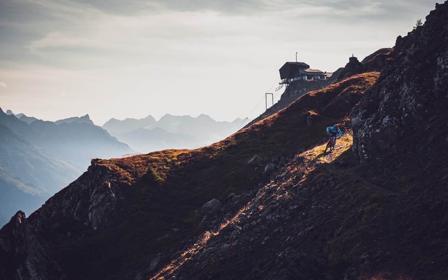 Ein Biker fährt über den Grat und geniesst die letzten Sonnenstrahlen auf dem Berg. | © Davos Klosters Mountains