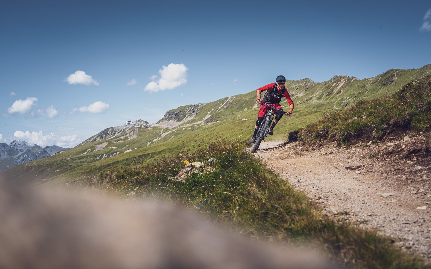 Ein Biker geniesst die Abfahrt auf dem Biketrail beim Chörbschhorn an einem wunderschönen Sommertag. | © Davos Klosters Mountains