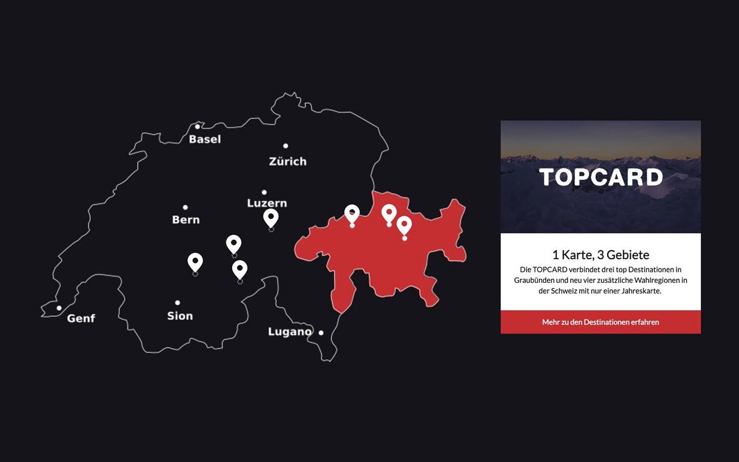 Ab der Wintersaison 2025/26 erhaltet Ihr zusätzlich zu den drei Regionen in Graubünden auch noch vier weitere Destinationen mit je drei Wahltagen während dem Winter mit dazu. Damit ist die TOPCARD ein attraktives Abo für die ganze Schweiz! Die neuen Wahlregionen sind: