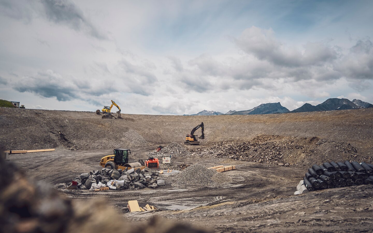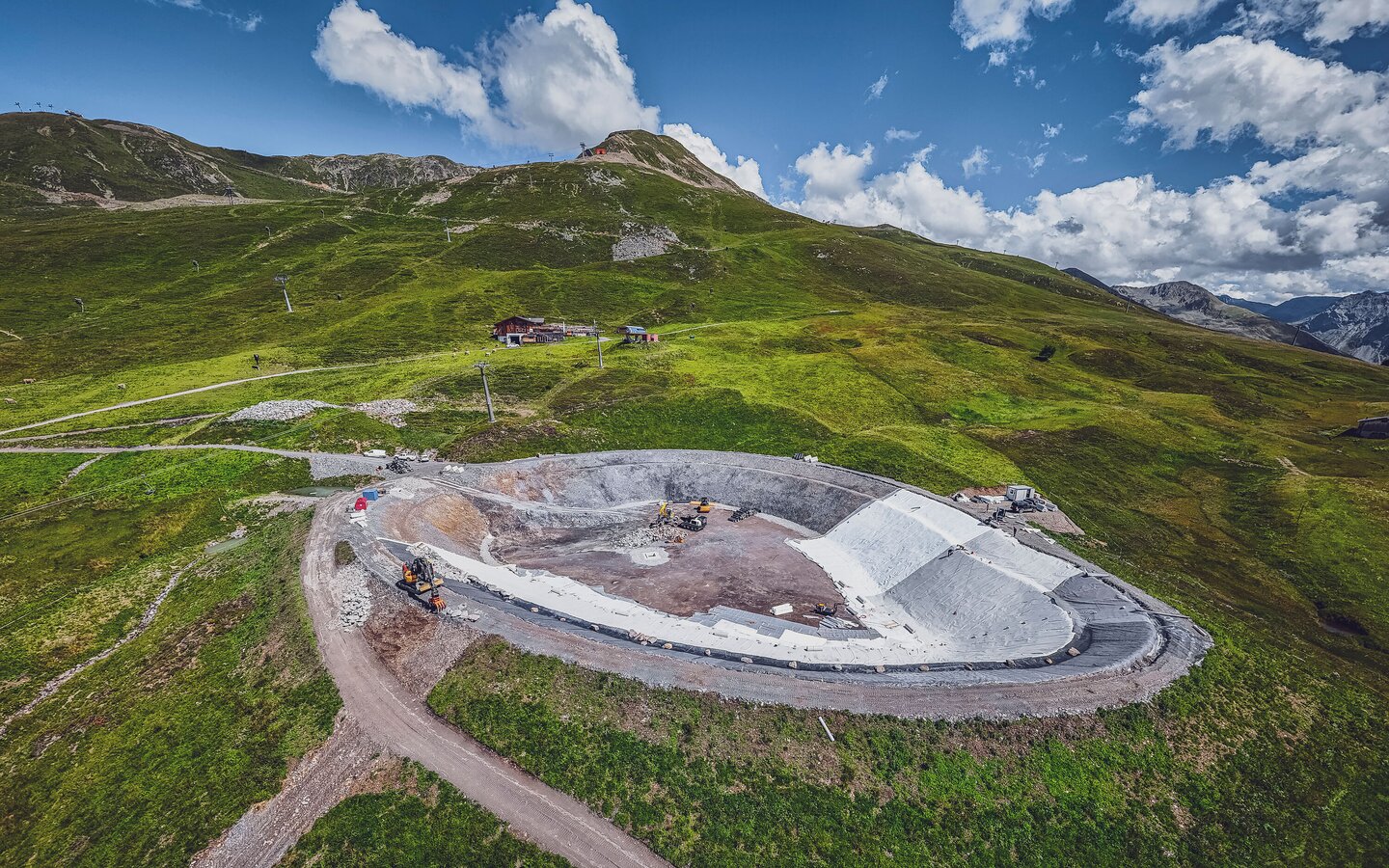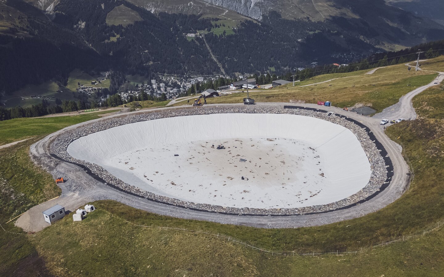 «Zurzeit wird die Folie Speichersee verlegt. Diese Arbeiten werden voraussichtlich bis Mitte/Ende August abgeschlossen. Dabei erfolgt in einem ersten Schritt das Anbringen von Sickermatte und Vlies-Schicht. Anschliessend wird die Abdichtungsfolie bahnen weise aufgebracht und mit der Maschine verschweisst.»