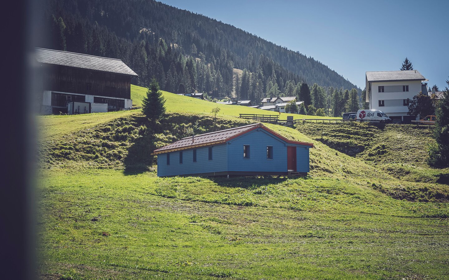 Mit ihrer auffälligen blauen Farbe ist die Skischulhütte auf dem Bolgenareal in Davos Platz in der Nähe der Jakobhornbahn kaum zu übersehen. Die Hütte befindet sich im Besitz der Davos Klosters Bergbahnen, die sie auch selbst im Sommer 2025 komplett neu gebaut haben. Seither erstrahlt sie in frischem Glanz.