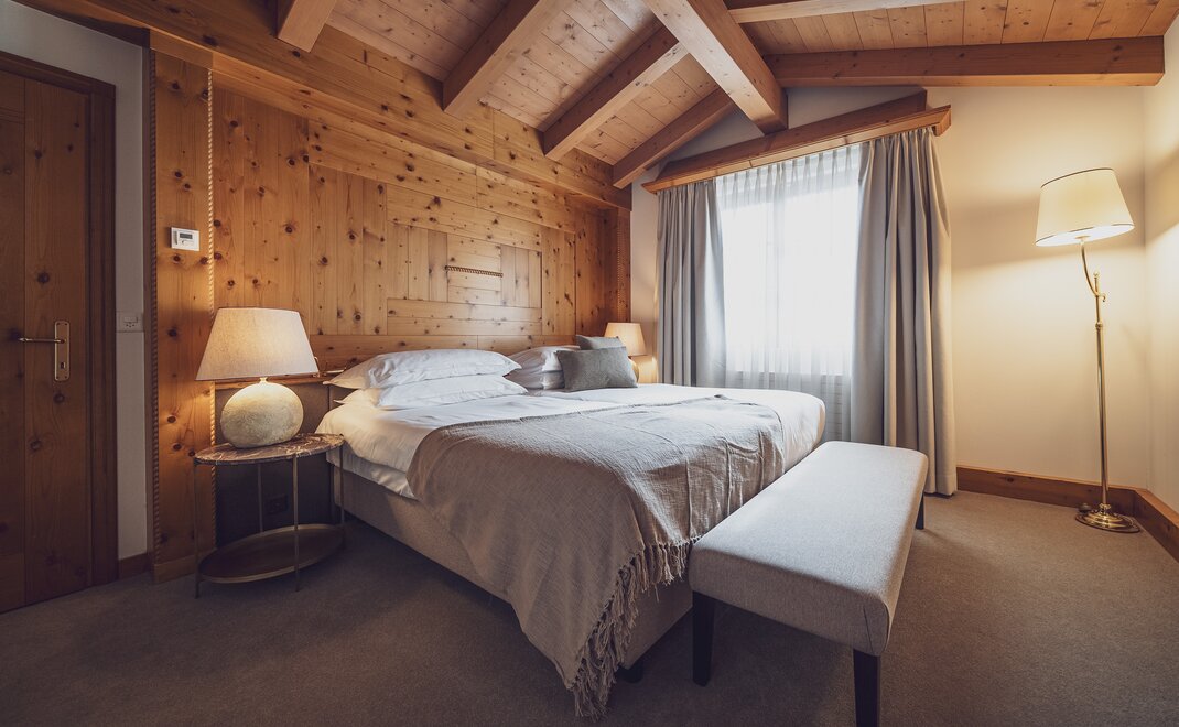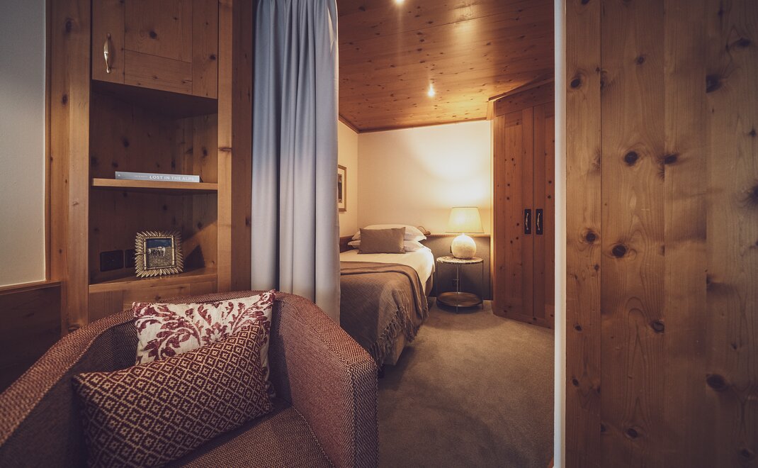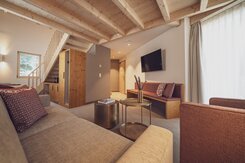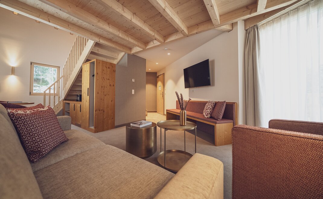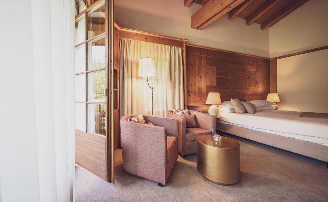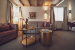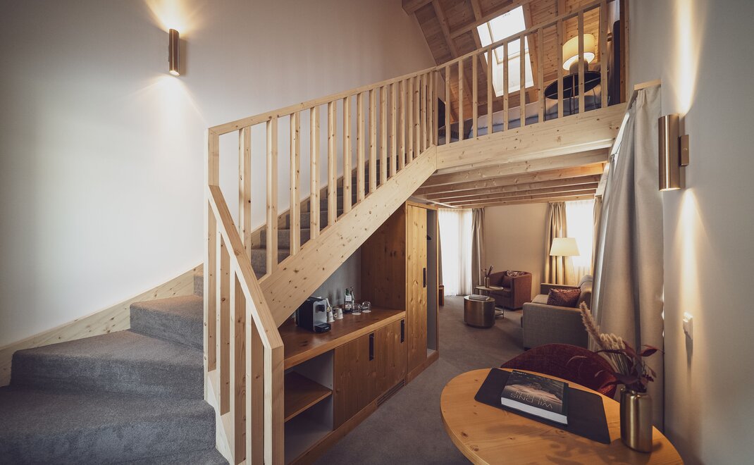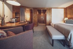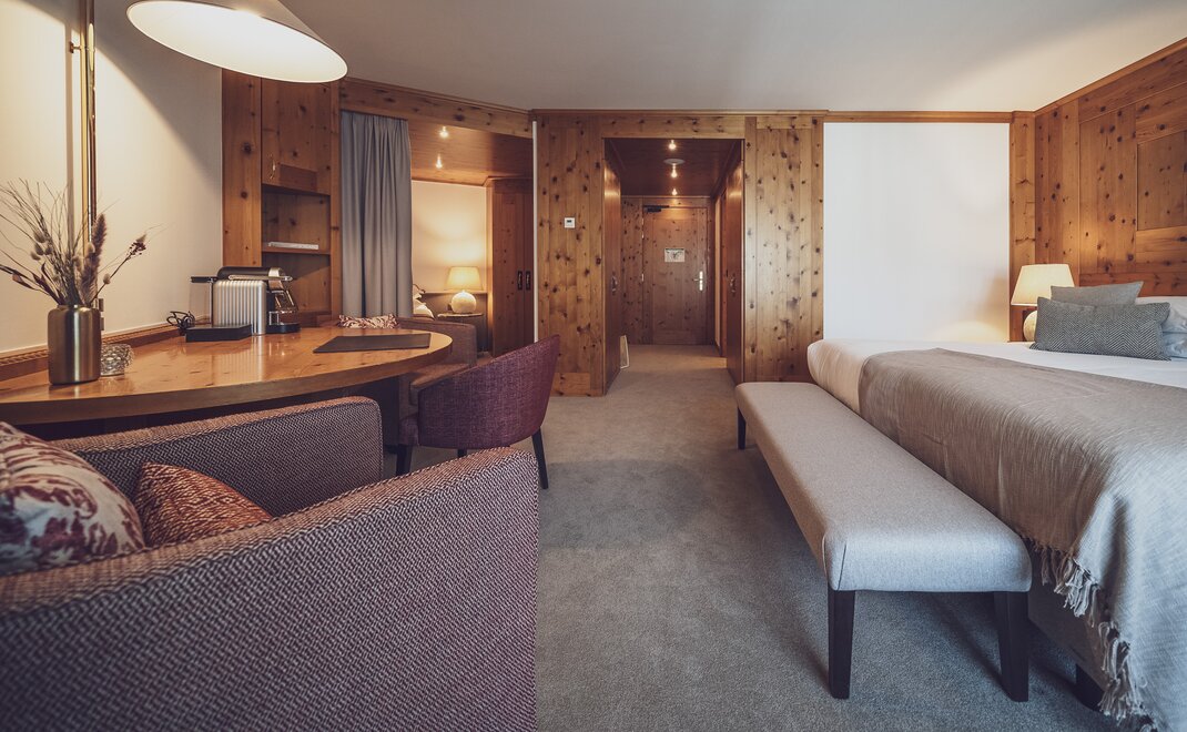 Alpen-Chic auf 55m2, separater Wohnraum, begehbarer Kleiderschrank, alle Zimmer mit Balkon oder Terrasse, Nespresso-Kaffeemaschine, kostenloses W-Lan, Safe und HD-TV. inklusive erste Füllung Minibar. Die Bettengrösse beträgt zwei 100x200cm oder auch 200x200cm. Unter den Senior Suiten befinden sich auch zwei Maisonette Suiten auf zwei Etagen - Fragen Sie gerne an bei Buchung nach.